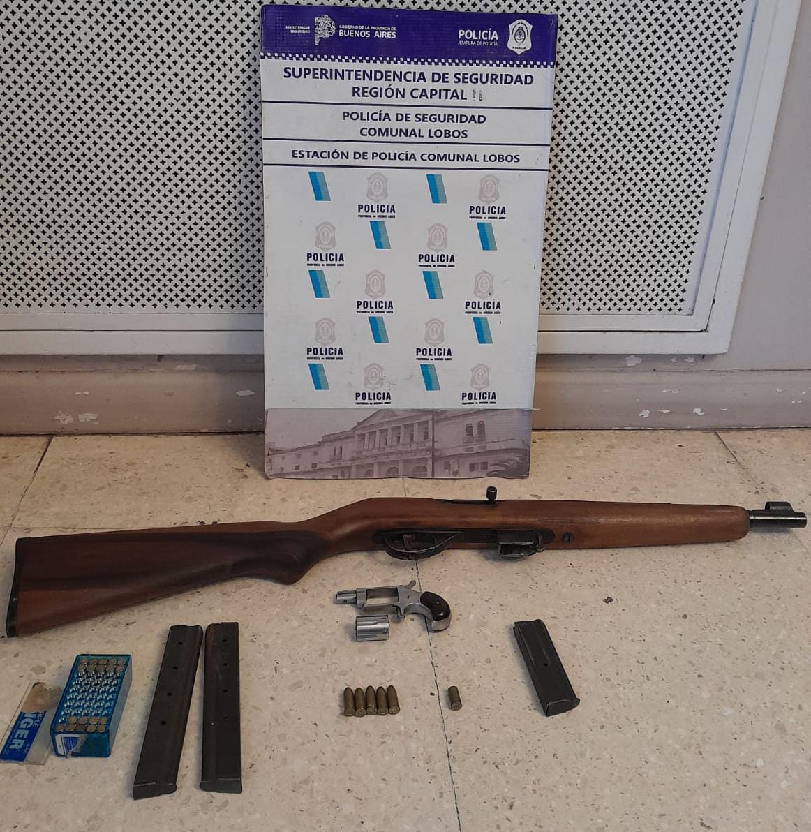 La Policía incautó allí una carabina calibre 22 Rubi Extraa MR, un revólver calibre 22 North American, tres cargadores calibre 22 y 19 cartuchos completos del mismo calibre, y una vaina servida calibre 32.