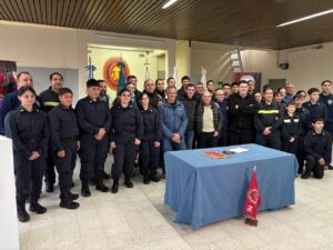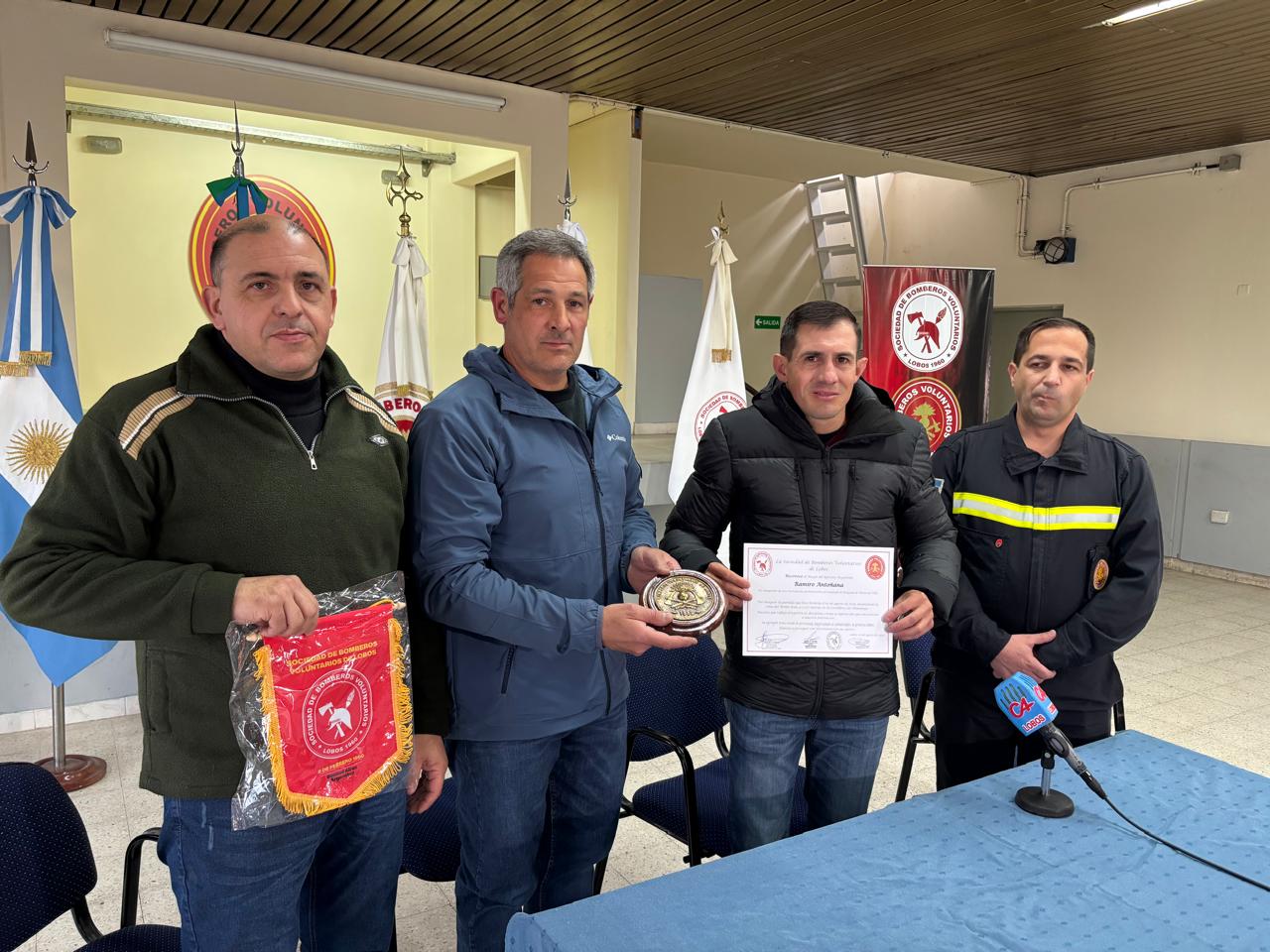En el salón del primer piso de la institución, Antoñana recibió un conceptuoso diploma en el que se detalla su mérito, un escudo de Bomberos de Lobos y un banderín de la institución.