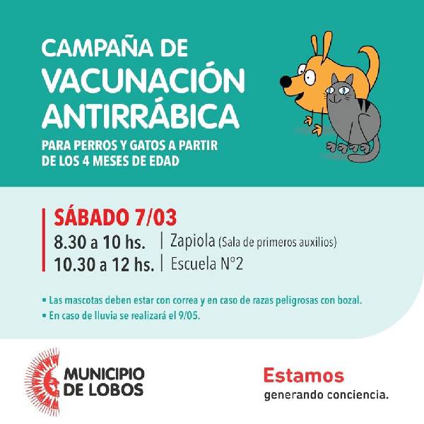 Este sábado vacunación antirrábica de 8:30 a 10 horas en Zapiola. Y de 10:30 a 12 horas en la Escuela N°2.
