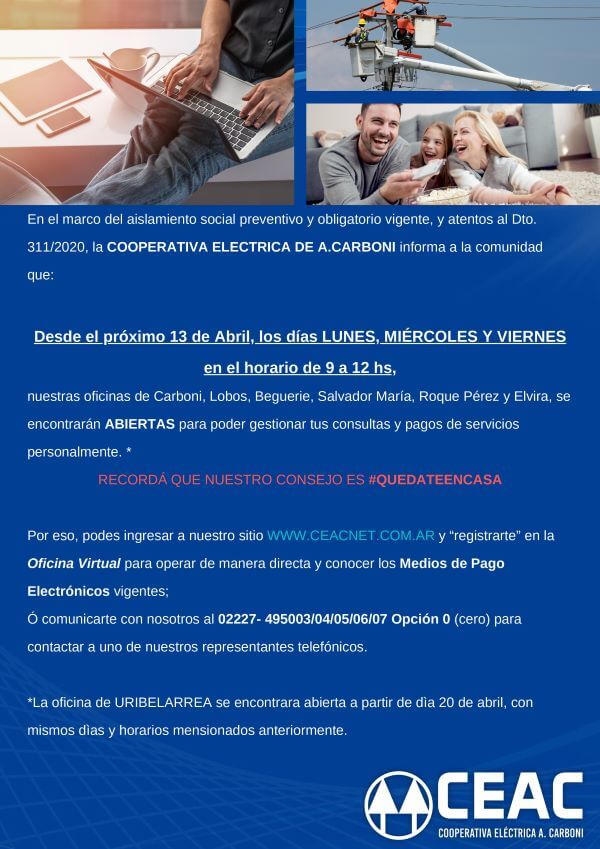 Desde el 13 de abril, los días lunes, miércoles y viernes, de 9 a 12 horas, nuestras oficinas de Carboni, Lobos, Beguerie, Salvador María, Roque Pérez y Elvira, se encontrarán abiertas para poder gestionar tus consultas y pagos de servicios personalmente.