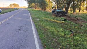 En esta mañana de domingo, los Bomberos Voluntarios fueron requeridos a la Ruta Provincial 41, en dirección Lobos-Monte, a unos 300 metros del puente del Toro, debido al despiste de un automóvil Toyota Corolla, patente FAB 011, que terminó impactando contra un árbol.