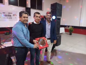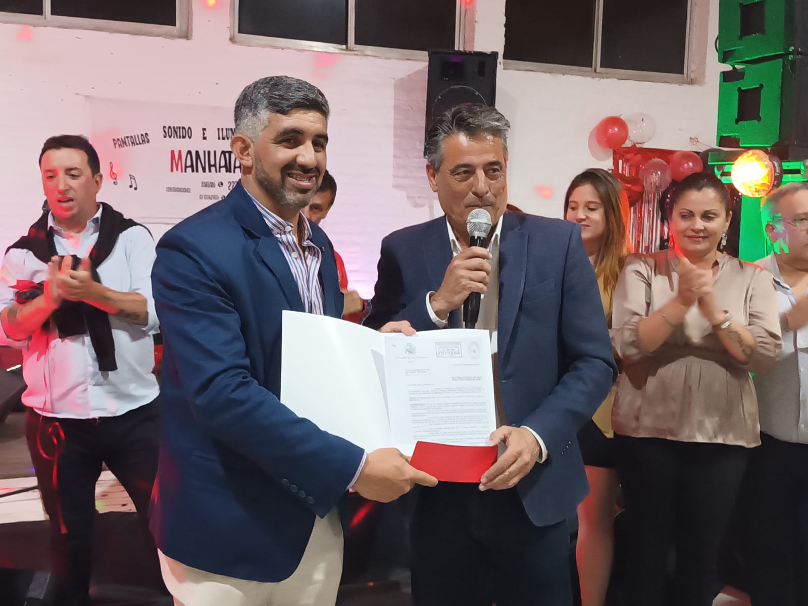 El Intendente Etcheverry, además de la copia de la Ordenanza, entregó al presidente del club, Osvaldo Cagliari, un presente, y lo propio hizo el titular de la Liga Lobense, Alcides Alves Márques..
