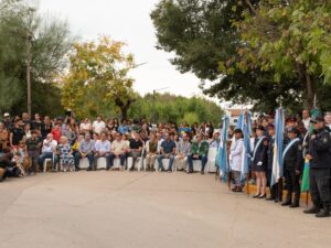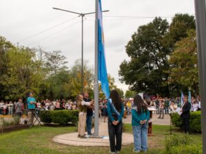 A las 15 tuvo lugar el acto protocolar frente a la rotonda de Las Cinco Esquinas, donde se inauguró un mástil y se izó la Bandera Nacional donada por la Asociación Belgraniana de Lobos, cuyo presidente, Gerardo Gutiérrez, compartió ese momento con la Secretaria de Gobierno, Myriam Lucavalli y alumnas de la escuela secundaria de la localidad.