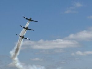 Después de la charla comenzó el espectáculo conmovedor brindado primero por los aviones B-45 Mentor que conforman la Escuadrilla Histórica de la Fuerza Aérea Argentina, que ofrecieron pasadas acrobáticas ante la admiración de todos los presentes que premiaron con un prolongado aplauso la habilidad de los pilotos una vez que concluyó la demostración.