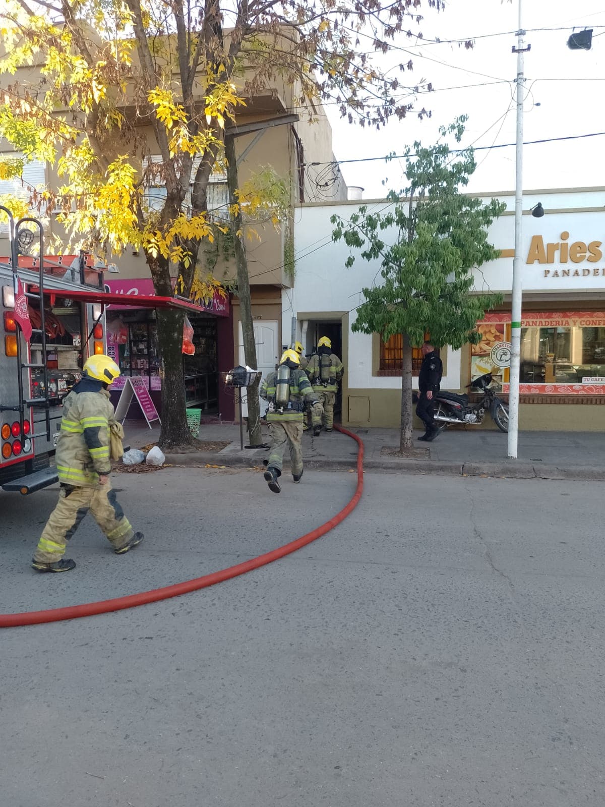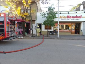 Una dotación del cuartel central de Bomberos Voluntarios controlaron esta tarde un principio de incendio declarado en el techo de uno de los hornos de la panadería y confitería Aries Moscoloni, en Salgado Oeste 169.